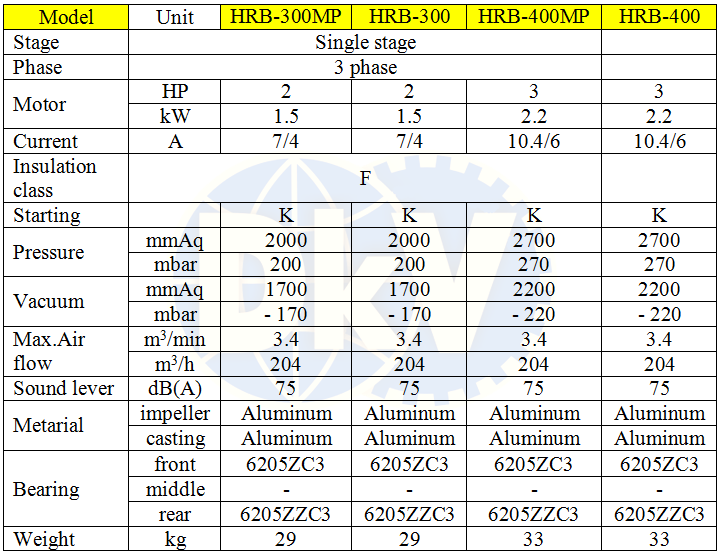 - Máy thổi khí con sò Hwanghae HRB-300MP, sử dụng động cơ 2HP/220 - 380V/50Hz/3ph, quấn dây đồng 100%, độ ồn max: 75 dB(A), sẽ giảm tiếng ồn khi lắp thêm ống giảm thanh tại cổ xả khí. Phân cánh quạt và thân vỏ được chế tạo bằng nhôm, giúp nhẹ và thoát nhiệt tốt.