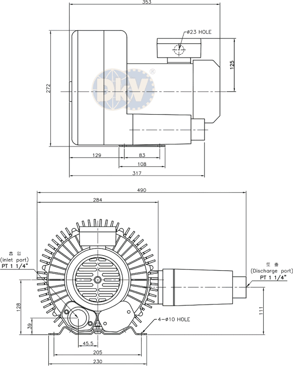 - Cổ hút và cổ xả của máy thổi khí Hwanghae HRB-302 đều có ren size tiêu chuẩn PT 1-1/4", thuận tiện khi kết nối với đường ống hoặc các phụ kiện (lọc gió đầu vào, ống giảm thanh, valve chỉnh áp....). Dưới đáy chân đế của máy thổi khí Hwanghae HRB-302 có 4 lỗ khoan Ø 10 mm, thuận tiện khi gá đặt.