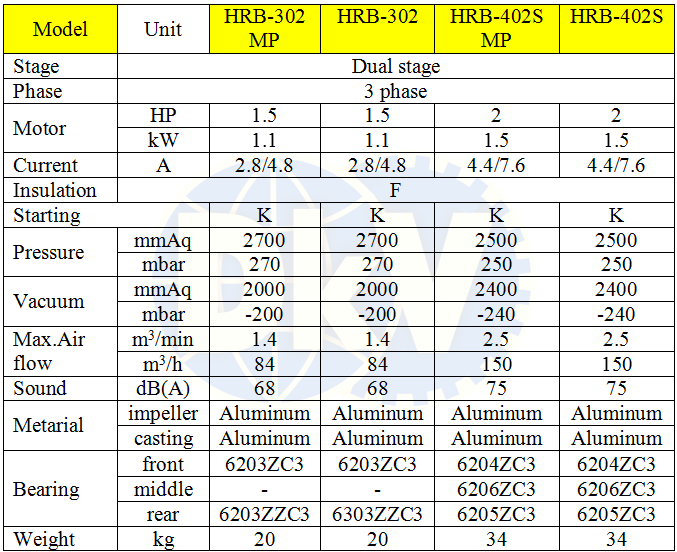 - Máy thổi khí Hwanghae HRB-302, sử dụng động cơ 1.5 HP/220 - 380V/50Hz/3ph, quấn dây đồng 100%, độ ồn max: 68 dB(A), sẽ giảm tiếng ồn khi lắp thêm ống giảm thanh tại cổ xả khí. Phân cánh quạt và thân vỏ được chế tạo bằng nhôm, giúp nhẹ và thoát nhiệt tốt.