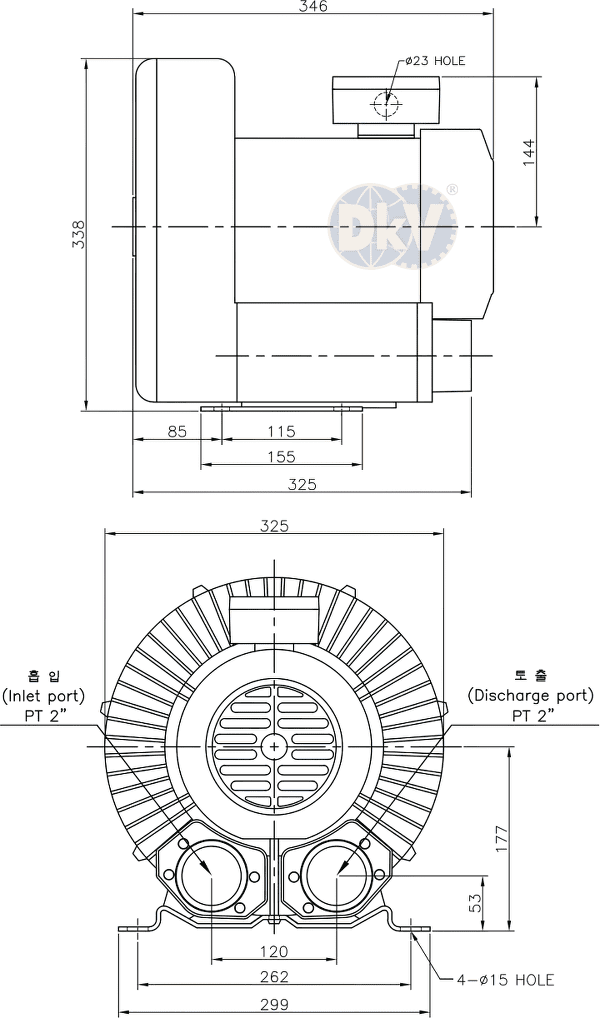 - Cổ hút và cổ xả của máy thổi khí Hwanghae HRB-400 đều có ren size tiêu chuẩn PT 2", thuận tiện khi kết nối với đường ống hoặc các phụ kiện (lọc gió đầu vào, ống giảm thanh, valve chỉnh áp....). Dưới đáy chân đế của máy thổi khí Hwanghae HRB-400 có 4 lỗ khoan Ø 15 mm, thuận tiện khi gá đặt.