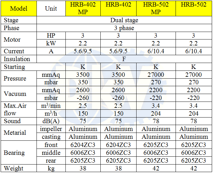 - Máy thổi khí Hwanghae HRB-402MP, sử dụng động cơ 3 HP/220 - 380V/50Hz/3ph, quấn dây đồng 100%, độ ồn max: 75 dB(A), sẽ giảm tiếng ồn khi lắp thêm ống giảm thanh tại cổ xả khí. Phân cánh quạt và thân vỏ được chế tạo bằng nhôm, giúp nhẹ và thoát nhiệt tốt.