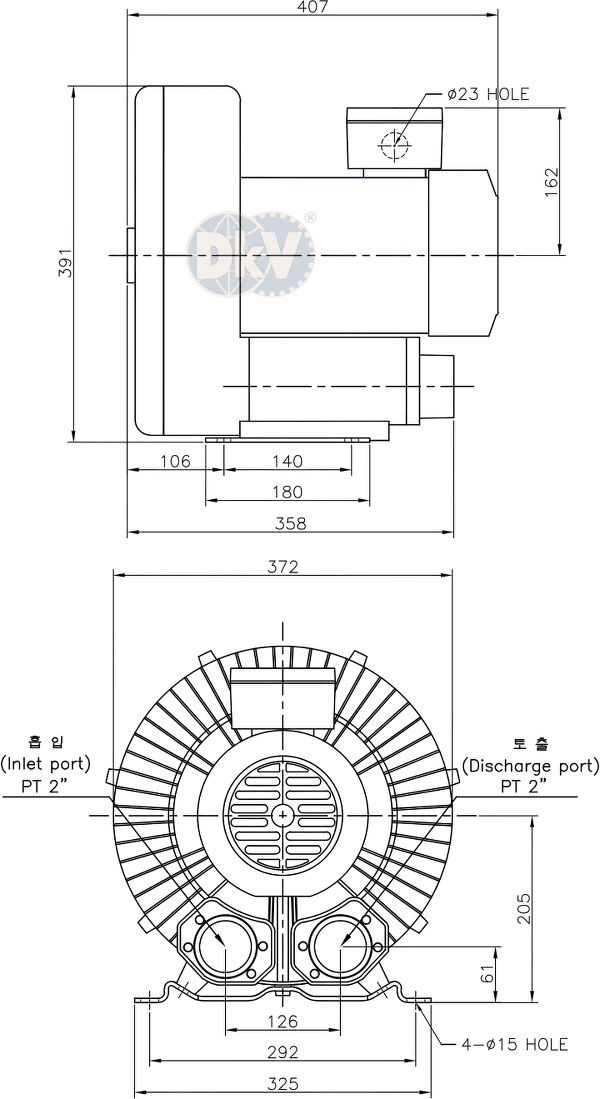 - Cổ hút và cổ xả của máy thổi khí con sò Hwanghae HRB-600MP đều có ren size tiêu chuẩn PT 2", thuận tiện khi kết nối với đường ống hoặc các phụ kiện (lọc gió đầu vào, ống giảm thanh, valve chỉnh áp....). Dưới đáy chân đế của máy thổi khí con sò Hwanghae HRB-600MP có 4 lỗ khoan Ø 15 mm, thuận tiện khi gá đặt.