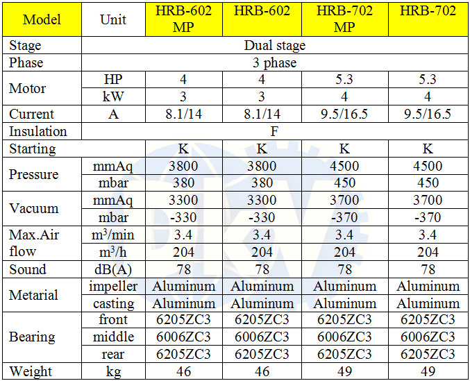 - Máy thổi khí Hwanghae HRB-702MP, sử dụng động cơ 5.3 HP/220 - 380V/50Hz/3ph, quấn dây đồng 100%, độ ồn max: 78 dB(A), sẽ giảm tiếng ồn khi lắp thêm ống giảm thanh tại cổ xả khí. Phân cánh quạt và thân vỏ được chế tạo bằng nhôm, giúp nhẹ và thoát nhiệt tốt.