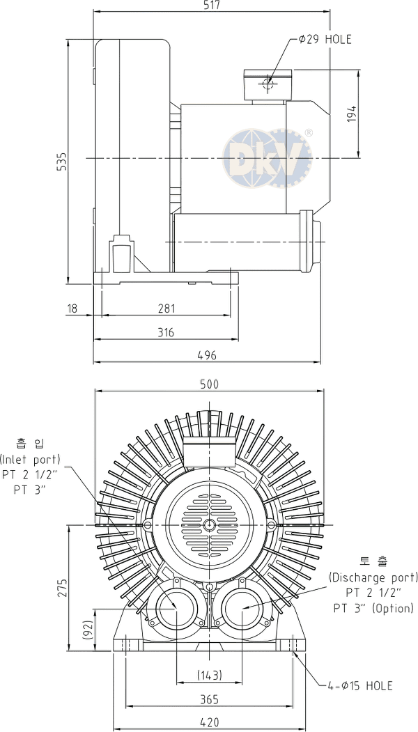 - Cổ hút và cổ xả của máy thổi khí Hwanghae HRB-800MP đều có ren size tiêu chuẩn PT 2-1/2", thuận tiện khi kết nối với đường ống hoặc các phụ kiện (lọc gió đầu vào, ống giảm thanh, valve chỉnh áp....). Dưới đáy chân đế của máy thổi khí Hwanghae HRB-800MP có 4 lỗ khoan Ø 15 mm, thuận tiện khi gá đặt.