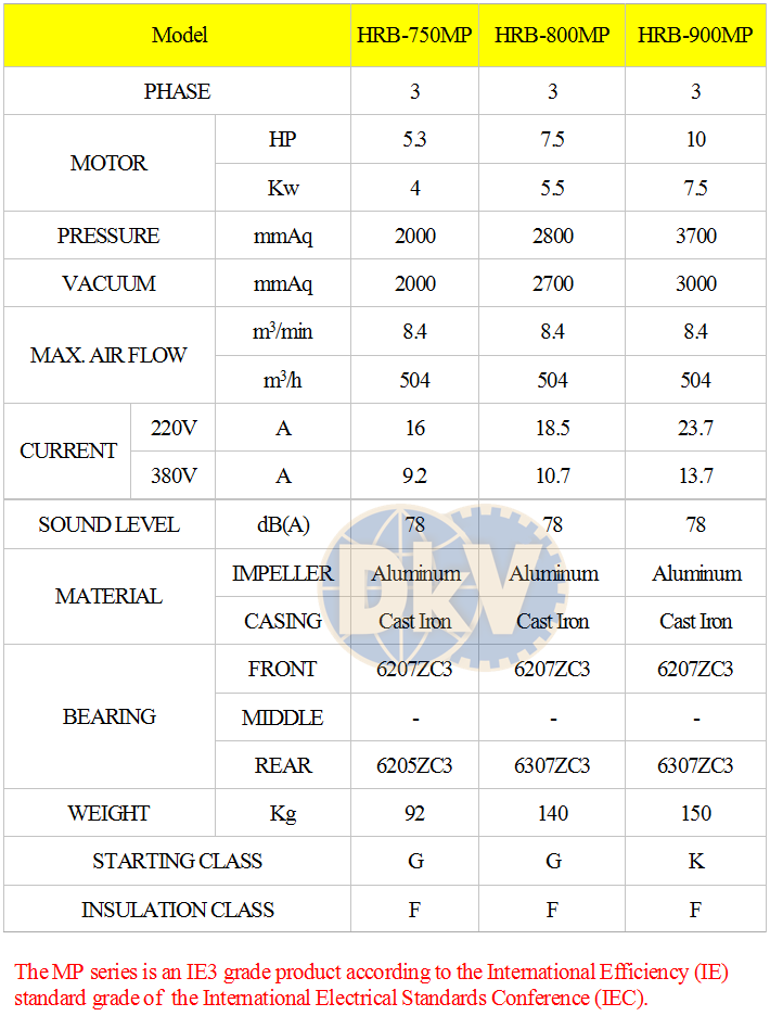 - Máy thổi khí Hwanghae HRB-900MP, Hwanghae ring blower HRB-900MP, Hwanghae slide channel blower HRB-900MP: có hình dạng con sò, thuộc loại 1 cấp - 1 satge (1 tầng) do Hwanghae | Korea sản xuất. Máy thổi khí Hwanghae HRB-900MP có lưu lượng max: 8.4 (m3/phút) | 504 m3/giờ, áp thổi max: 3.700 mmAq (370 mbar) | cột áp 3.7 mét, độ chân không: - 3.000 mmAq (-300 mbar), chuyên dùng để hút/thổi khí trong dân dụng và công nghiệp.
