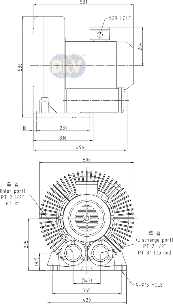 - Cổ hút và cổ xả của máy thổi khí Hwanghae HRB-900MP đều có ren size tiêu chuẩn PT 2-1/2", thuận tiện khi kết nối với đường ống hoặc các phụ kiện (lọc gió đầu vào, ống giảm thanh, valve chỉnh áp....). Dưới đáy chân đế của máy thổi khí Hwanghae HRB-900MP có 4 lỗ khoan Ø 15 mm, thuận tiện khi gá đặt.