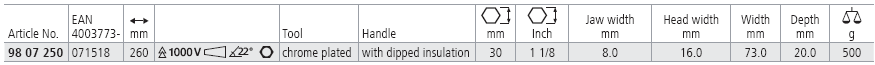 - Mỏ lết cách điện Knipex 98 07 250 chế tạo theo tiêu chuẩn cách điện IEC 60900.