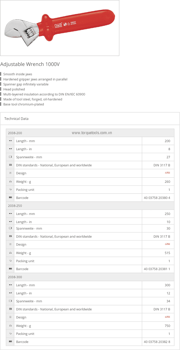 - Mỏ lết cách điện NWS 2038-200, NWS insulated adjustable spanners 2038-200: có độ mở max: 27 mm, chiều dài: 200 mm, chuyên dùng để siết bulong, đai ốc trong môi trường cao thế 1.000 V.