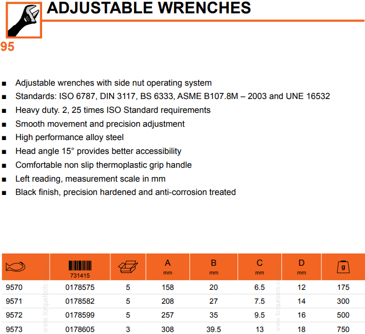 - Mỏ lết Bahco 9570, Bahco adjustable wrench 9570 chuyên dùng để siết bulong, đai ốc trong công nghiệp., có độ mở max: 20 mm, chiều dài 158 mm.