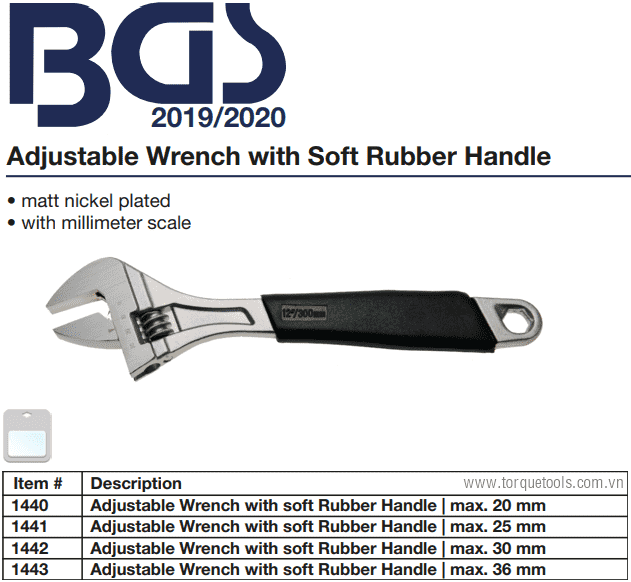 - Mỏ lết BGS 1440, BGS adjustable spanner 1440: là loại dụng cụ siết đa năng, có độ mở max: 19 mm, chiều dài tổng thể 150 mm, chuyên dùng để siết bulong, đai ốc trong công nghiệp.