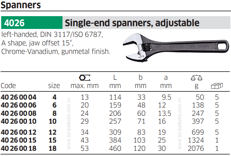 - Mỏ lết Stahlwille 40260004 được chế tạo bằng vật liệu Chrome vanadi theo tiêu chuẩn DIN 3117/ ISO 6787.