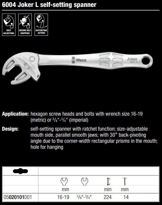- Mỏ lết Wera 05020101001, Wera adjustable wrench 05020101001: chuyên dùng để siết bulong, đai ốc trong công nghiệp., có độ mở max:19 mm, chiều dài 224 mm.