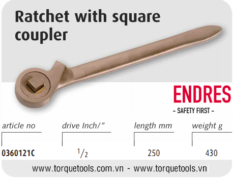 - Tay công chống cháy nổ Endres 0360121C, Endres non sparking ratchet wrench 0360121C được chế tạo bằng hợp kim đồng/Bery (Cu Be) hoặc đồng/nhôm (Br Al) có size nhét khẩu 1/2", chiều dài 250 mm,.
