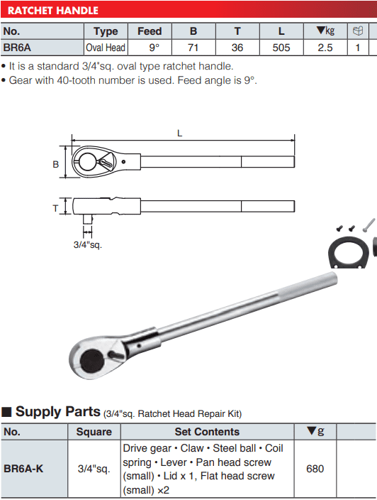 - Tay công KTC BR6A, KTC ratchet wrench BR6A: được chế tạo bằng thép cường lực và nhựa công nghiệp, có size nhét khẩu 3/4", chiều dài 505 mm, chuyên dùng để siết bulong, đai ốc, vít..trong công nghiệp.