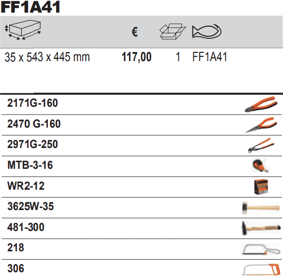Toàn bộ bộ dụng cụ Bahco FF1A41 đựng trong khay xốp ( 42x445x543 mm). Made in USA.