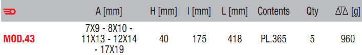 - Bộ cờ lê 2 đầu hở Facom MOD.43, Facom wrench set MOD.43 gồm 5 chi tiết cờ lê miệng hở hai đầu (7x9 - 17x19 mm), được đóng trong túi cuộn, sử dụng trong công nghiệp lắp ráp, bảo dưỡng, service.