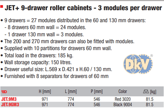 - Mỗi ngăn kéo của thùng dụng cụ Facom JET.9M3 có trọng lượng ngăn kéo: 185 kg.