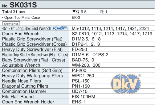 Thùng dụng cụ KTC SK031S, KTC mechanic tools sets SK031S: là một thùng dụng cụ gồm 31 chi tiết, chuyên dùng để siết/vặn bulong, đai ốc, vít,... trong công nghiệp.