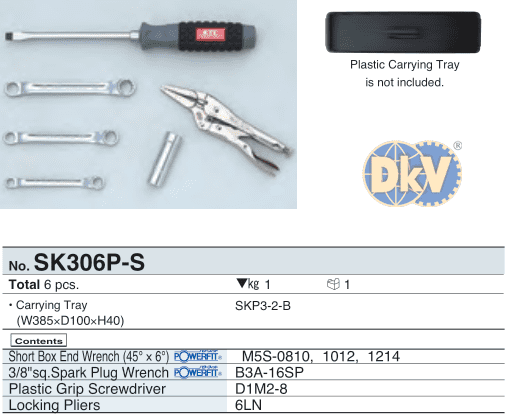 Khay dụng cụ KTC SK306P-S, KTC mechanic tools kit SK306P-S: là một khay dụng cụ gồm 6 chi tiết, size cắm khẩu: 3/8", chuyên dùng để siết/vặn bulong, đai ốc, vít,... trong công nghiệp.
