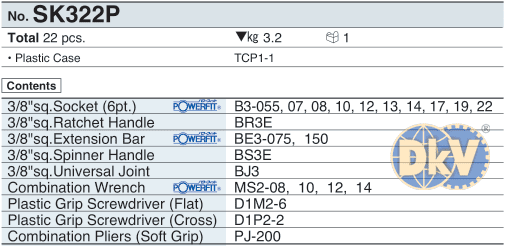Thùng dụng cụ KTC SK322P, KTC mechanic tools sets SK322P: là một thùng dụng cụ gồm 22 chi tiết, size cắm khẩu: 3/8", chuyên dùng để siết/vặn bulong, đai ốc, vít,... trong công nghiệp.