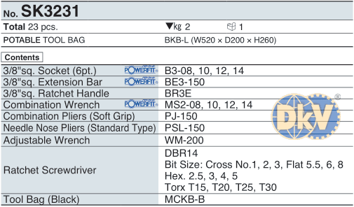 Túi dụng cụ KTC MCK3231, KTC rider's maintenance tools set MCK3231: là một túi vải dụng cụ gồm 23 chi tiết, size cắm khẩu: 3/8", chuyên dùng để siết/vặn bulong, đai ốc, vít,... trong công nghiệp.