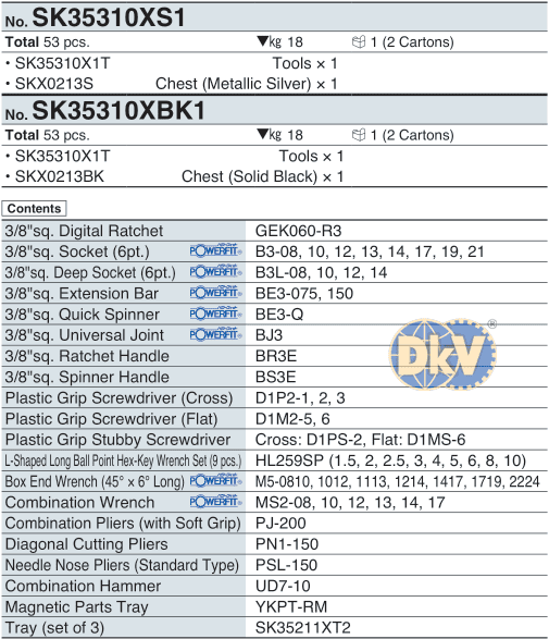 Thùng dụng cụ KTC SK35310XS1, KTC mechanic tools sets SK35310XS1: là một thùng dụng cụ gồm 53 chi tiết, size cắm khẩu: 3/8", chuyên dùng để siết/vặn bulong, đai ốc, vít,... trong công nghiệp.