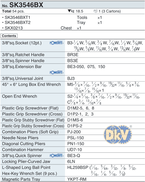Thùng dụng cụ KTC SK3546BX, KTC mechanic tools sets SK3546BX: là một thùng dụng cụ xe đẩy gồm 59 chi tiết, size cắm khẩu: 3/8", chuyên dùng để siết/vặn bulong, đai ốc, vít,... trong công nghiệp.