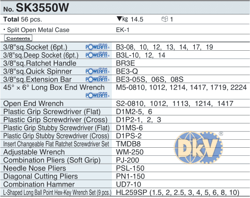 Thùng dụng cụ KTC SK3550W, KTC mechanic tools sets SK3550W: là một thùng dụng cụ gồm 56 chi tiết, size cắm khẩu: 3/8", chuyên dùng để siết/vặn bulong, đai ốc, vít,... trong công nghiệp.