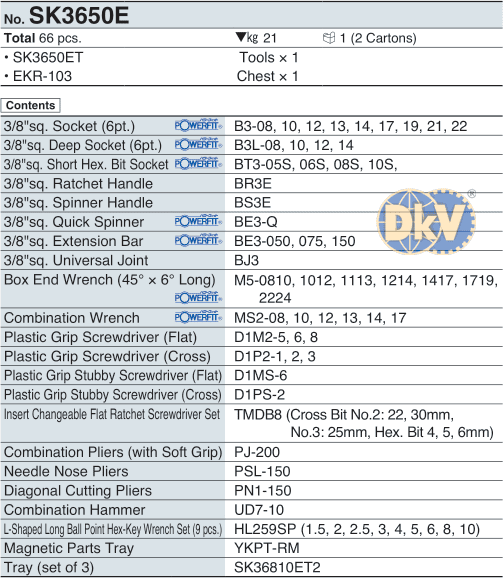 Thùng dụng cụ KTC SK3650E, KTC mechanic tools sets SK3650E: là một thùng dụng cụ gồm 66 chi tiết, size cắm khẩu: 3/8", chuyên dùng để siết/vặn bulong, đai ốc, vít,... trong công nghiệp.