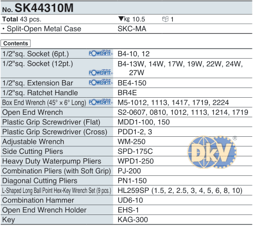 Thùng dụng cụ KTC SK44310M, KTC mechanic tools sets SK44310M: là một thùng dụng cụ gồm 43 chi tiết, size cắm khẩu:1/2", chuyên dùng để siết/vặn bulong, đai ốc, vít,... trong công nghiệp.
