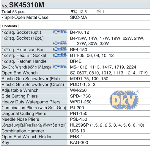 Thùng dụng cụ KTC SK45310M, KTC mechanic tools sets SK45310M: là một thùng dụng cụ gồm 53 chi tiết, size cắm khẩu:1/2", chuyên dùng để siết/vặn bulong, đai ốc, vít,... trong công nghiệp.
