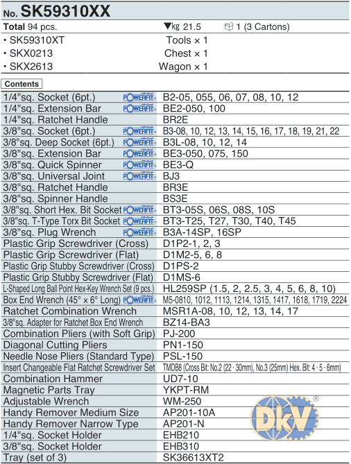 Thùng dụng cụ KTC SK59310XX, KTC mechanic tools sets SK59310XX: là một thùng dụng cụ xe đẩy gồm 94 chi tiết, size cắm khẩu: 1/4", 3/8", chuyên dùng để siết/vặn bulong, đai ốc, vít,... trong công nghiệp.