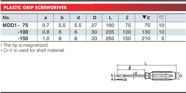 - Tô vít hai cạnh KTC MDD1-75 (KTC phillips scewdriver MDD1-75): thuộc dòng sản phẩm tô vít siết chính xác của KTC, loại vít 4 cạnh theo tiêu chuẩn Slotted 5.5 mm, trong công nghiệp. Chiều dài 160 mm.