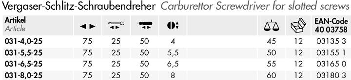 - Tô vít hai cạnh NWS 031-4,0-25 (NWS slotted scewdriver 031-4,0-25) thuộc dòng sản phẩm tô vít siết chính xác của NWS, các loại vít 2 cạnh theo tiêu chuẩn Slotted 4 mm, chiều dài: 75 mm, sử dụng phổ biến trong công nghiệp.