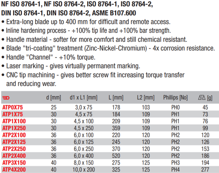 - Chế tạo theo tiêu chuẩn ISO 8764-1/ISO 8764-2, trong đó phần lưỡi tô vít facom ATP2X250 chế tạo bằng thép, phần chuôi có in đường kính size vít cần vặn.