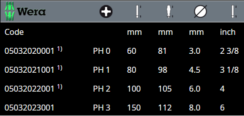- Tô vít bốn cạnh Wera 05032021001 (Wera phillips scewdriver 05032021001) thuộc dòng sản phẩm Kraftform Stainless của Wera tô vít siết chính xác, các loại vít 4 cạnh theo tiêu chuẩn Phillips PH1, trong công nghiệp.
