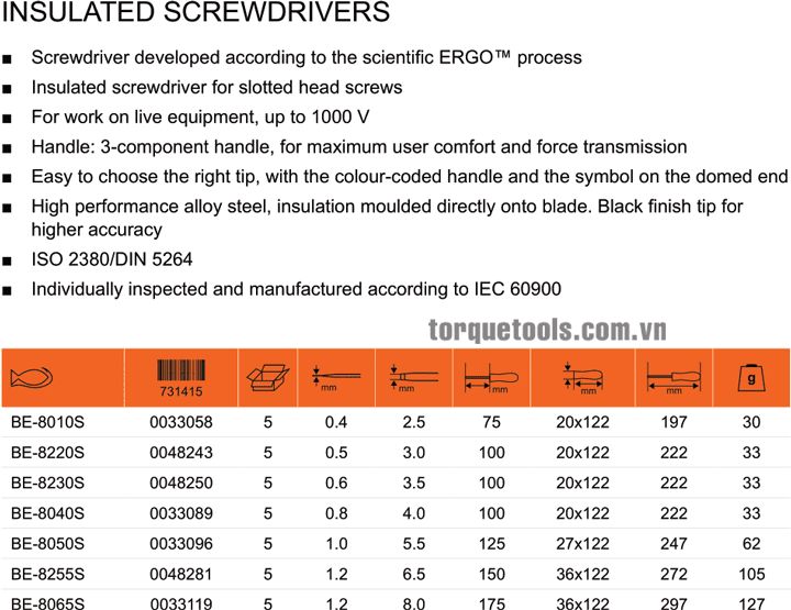 - Tô vít cách điện 2 cạnh Bahco BE-8010S, Bahco VDE scewdriver BE-8010S: thuộc loại tô vít siết chính xác, các loại vít 2 cạnh theo tiêu chuẩn Slotted: 2.5 mm, chiều dài: 178 mm, trong môi trường điện cao thế (< 1.000 V).