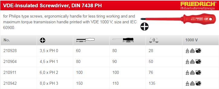 - Tô vít cách điện 4 cạnh Friedrich 210904 (Friedrich VDE scewdriver 210904) thuộc loại tô vít siết chính xác, các loại vít 4 cạnh theo tiêu chuẩn Phillips PH 1, trong môi trường điện cao thế (< 1.000 V).